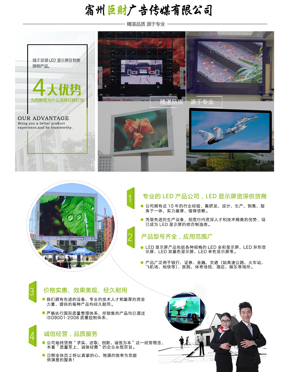 宿州巨財(cái)廣告?zhèn)髅阶溆诎不帐∷拗菔兴廾陕?,是一家設(shè)計(jì)、制作、安裝、售后為一體的高新科技技術(shù)企業(yè)。巨財(cái)廣告?zhèn)髅絽R集了大批高素質(zhì)人才,擁有現(xiàn)代化的專(zhuān)業(yè)生產(chǎn)設(shè)備與檢測(cè)設(shè)備,實(shí)行了全自動(dòng)化生產(chǎn),高度保障了公司核心產(chǎn)品—LED顯示屏的性能,可及時(shí)滿(mǎn)足客戶(hù)的需求。 宿州巨財(cái)廣告?zhèn)髅街饕铝τ谙蚩蛻?hù)提供高質(zhì)量LED全彩顯示屏,公司在發(fā)展壯大過(guò)程中,已經(jīng)完成各...